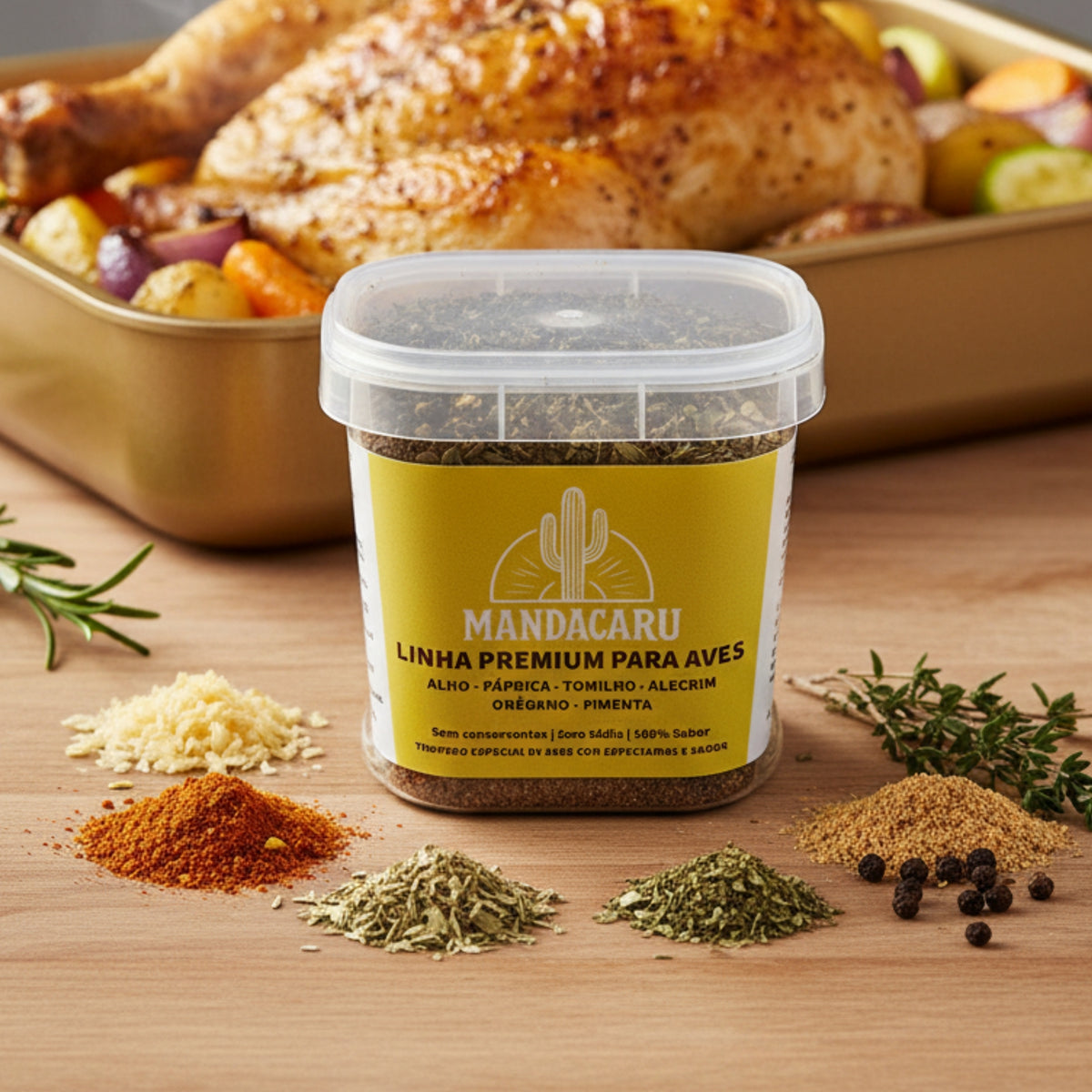 O Tempero Natural Mandacaru Linha Premium Aves foi desenvolvido para valorizar a leveza, o aroma e a textura das carnes brancas, respeitando o sabor original do alimento e trazendo equilíbrio ao preparo.