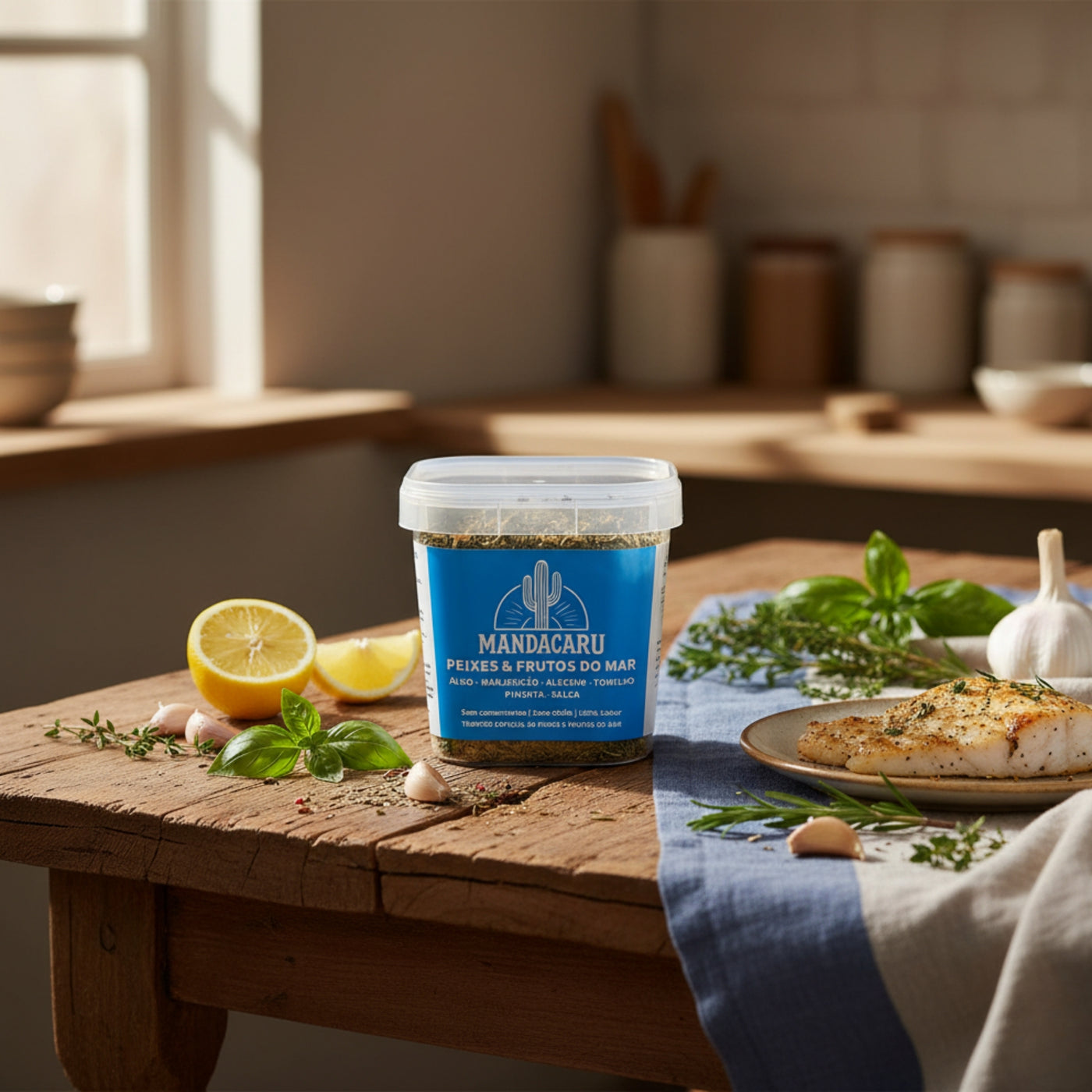 O Tempero Natural Mandacaru Peixes & Frutos do Mar foi desenvolvido para valorizar o frescor e a delicadeza dos ingredientes marinhos, preservando o sabor original de cada preparo.